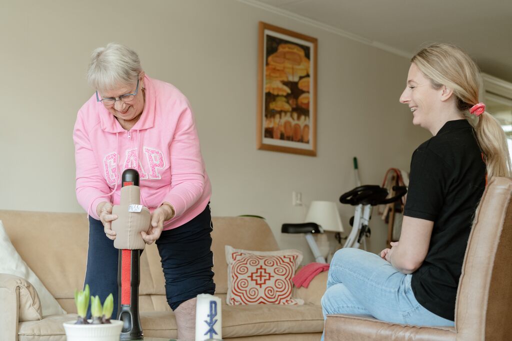 Daarna laat Koppenhagen verschillende hulpmiddelen zien, variërend van Handyleg/fix tot Doff N’Donner. ‘Ik demonstreer hoe de hulpmiddelen werken, kijk samen wat past bij de cliënt. We oefenen vervolgens samen, zo nodig ook met de mantelzorger. Ik maak vervolgens een instructiefilmpje op de telefoon van de cliënt, zodat dit altijd terug te kijken is’, legt ze uit. ‘Ik laat het hulpmiddel en mijn nummer achter, de cliënt gaat zelf oefenen. Vaak is het genoeg om nog één keer mee te kijken, daarna kunnen veel mensen het zelf. Als ik na een paar dagen bel om te vragen hoe het gaat, krijg ik bijna altijd een vrolijke, trotse cliënt aan de lijn.’