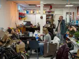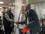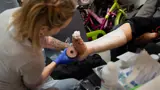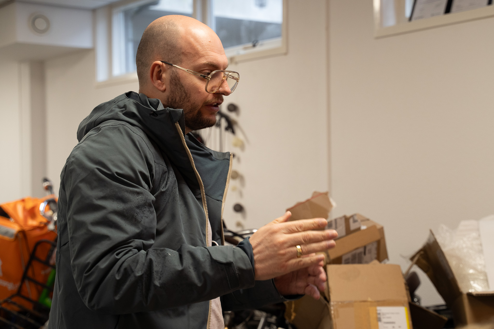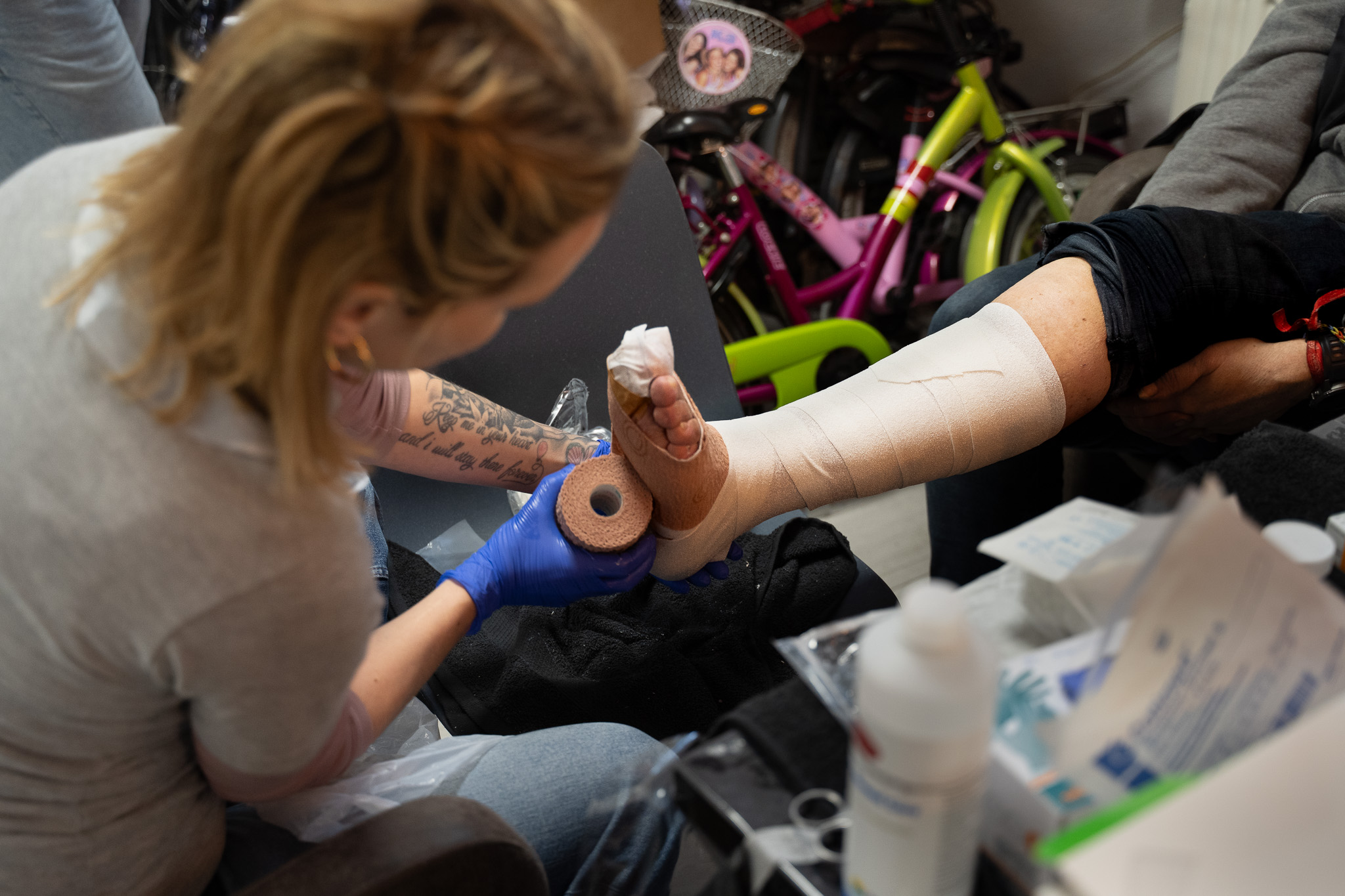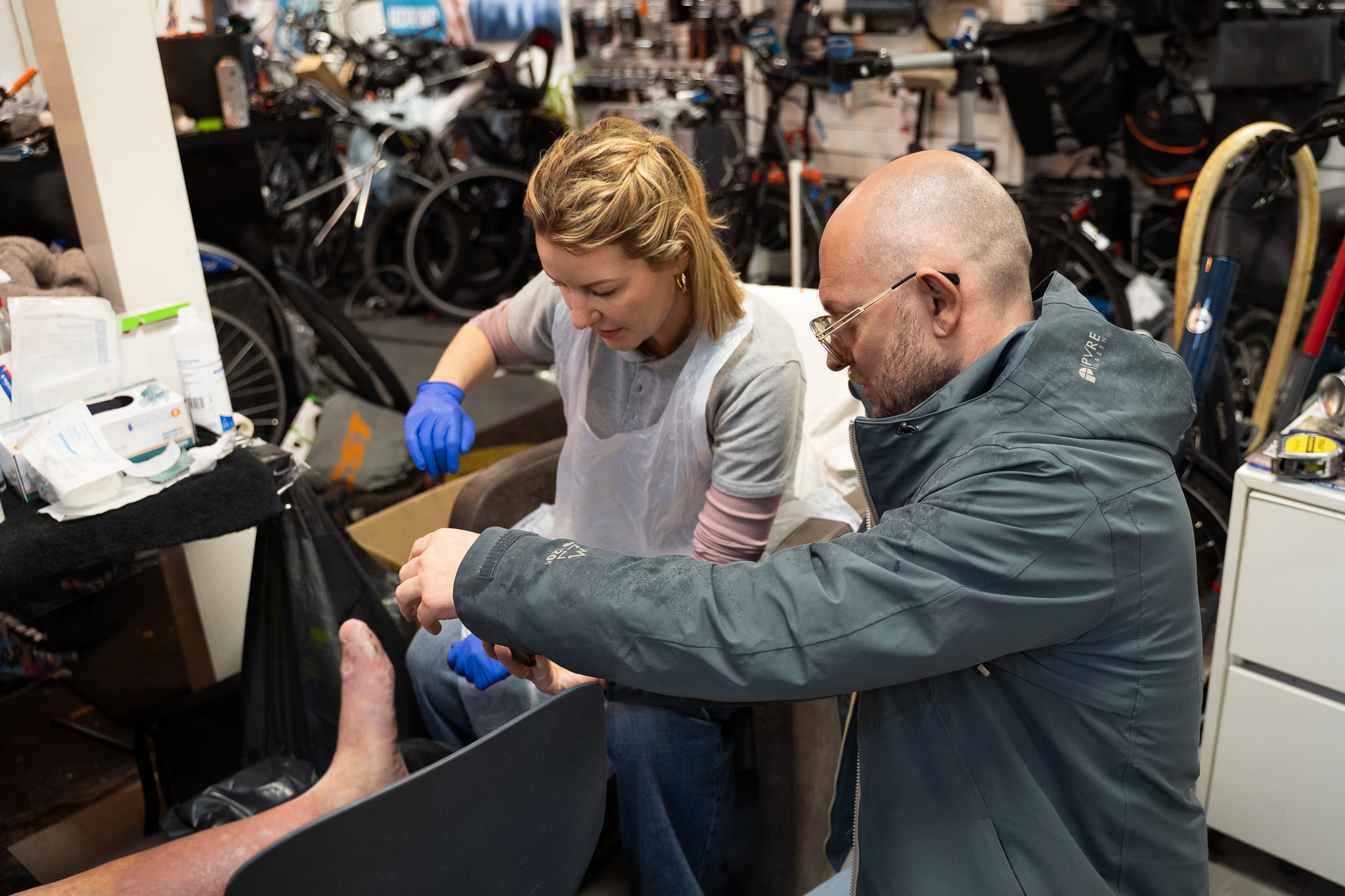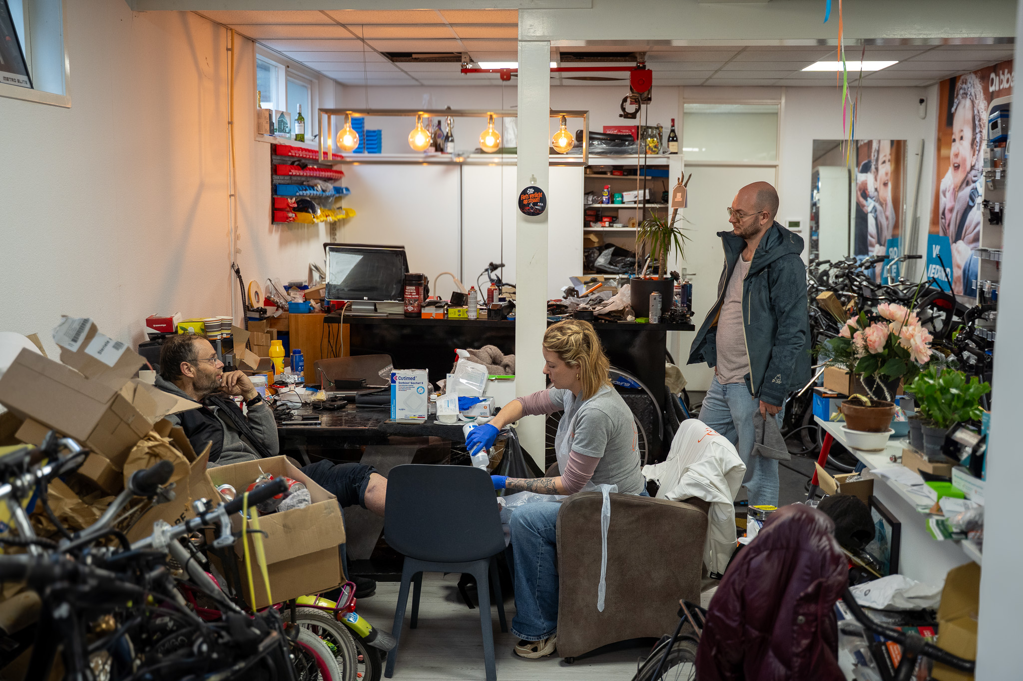Daarna fietsen we door naar de volgende locatie: een fietsenwinkel. Remi heeft hier met haar cliënt afgesproken omdat dat voor hem praktisch is. Ze gaat zijn wond verzorgen. “Geen wond is hetzelfde; elke wond vraagt om ander materiaal en een andere behandeling. Remi werkt zeer steriel en wisselt regelmatig van handschoenen en materialen.”, vertelt Remi